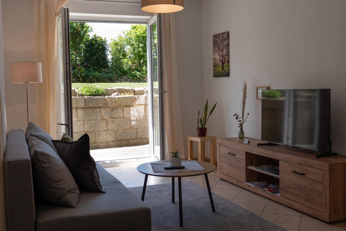 Our lovingly furnished apartment is located in a quiet residential area on the outskirts of Kirchehrenbach. The apartment is 38 square meters and is located in the basement of a detached house. It has a separate entrance and outdoor seating. There is space for 2 people. The kitchen-living room is a walk-through room from the bedroom to the bathroom. The apartment is fully furnished. A parking space is available in front of the property.