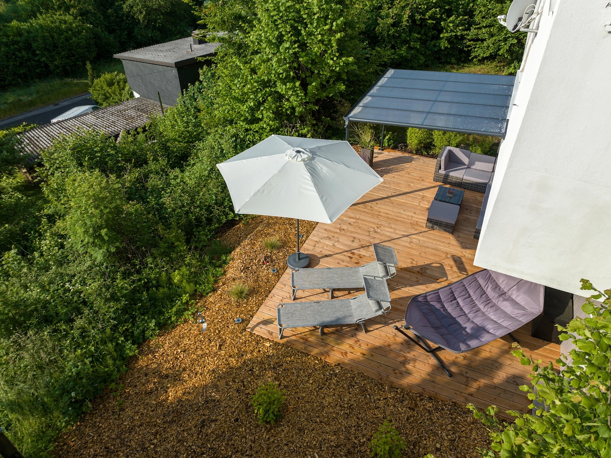 A vacation home with a garden all to yourself. Our romantic vacation home is located in the middle of nature, on a sunny, forested slope above the small village of Mühlbach. The well-kept garden, enclosed with a hedge, has many nice seating areas. In the garden there is a small pond, two beautiful large sun loungers and a grill. The beautiful view of the village and the beautiful low mountain landscape enchants every guest. One pet is allowed.