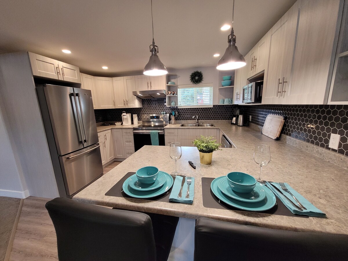 Spacious 900 sq ft private king suite 5 min to BC Ferries & hospital. Full kitchen, bathroom & in-suite laundry for easy longer stays. Large living room with extra sleeping space. Quiet area backing onto green space with big yard & fire pit (wood included). Pet friendly 🐾 (because trips are better when the whole family comes) 15-min walk to town, restaurants & parks. Perfect for traveling nurses, medical stays, ferry stopovers, or anyone needing a calm, comfy place to relax and unwind.