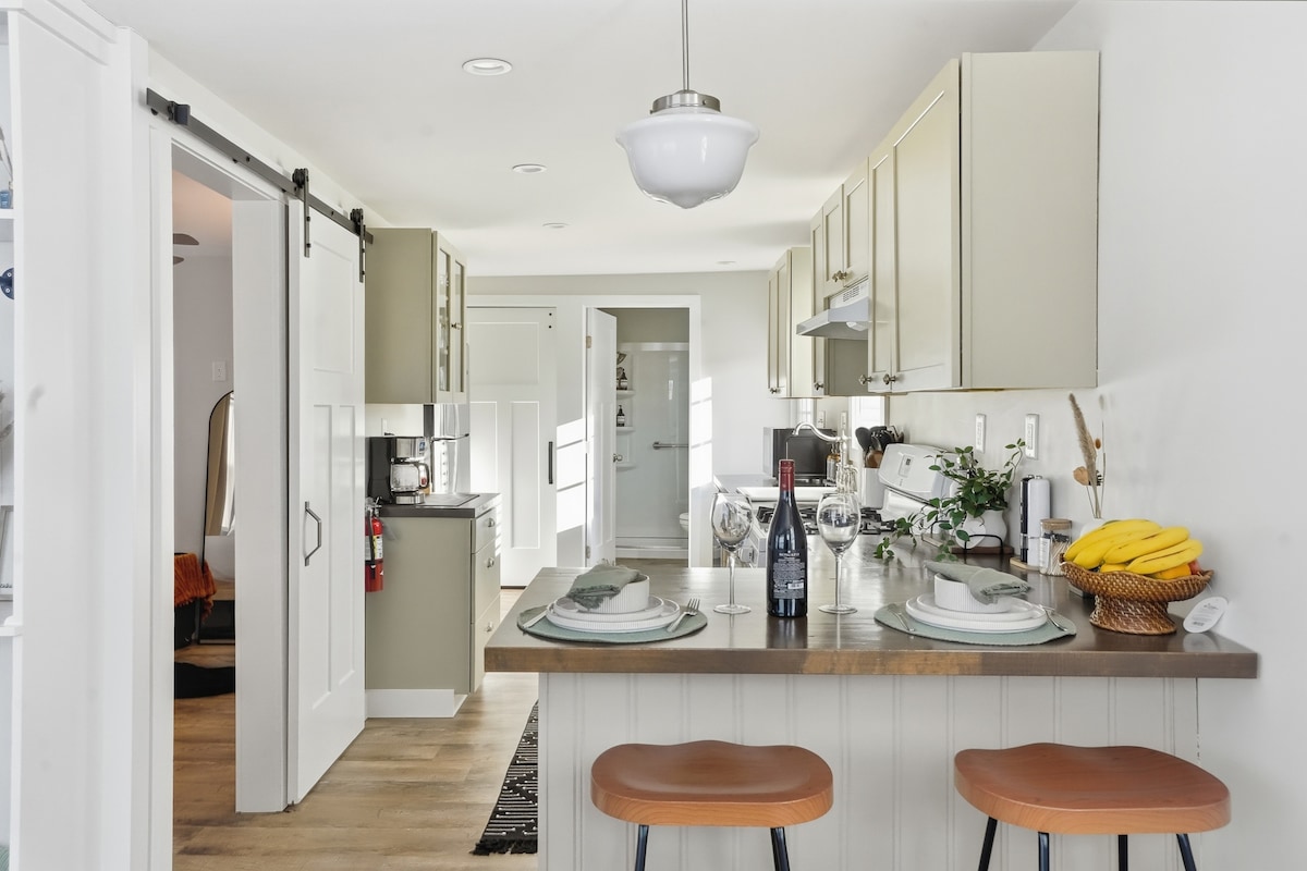 Ultra Chic Cottage set high above Greenwood Lake with Private beach and lake front community access. Minutes away from Mountain Creek Ski Resort, Spa & Water park, Mt. Peter Ski & Tubing, Warwick creameries, breweries & vineyards & apple picking. 1 BR, 1 Bath, play/office/common room. Huge wrap around fenced in deck with Mid century modern fireplace allows for scenic dining, lounging and around the fire gatherings. #LakeViewCottage_GWL Town of Warwick Short Term Rental Permit #P25-0245