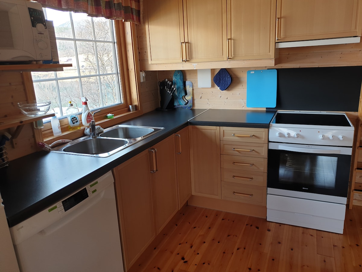 Beautiful lake house overlooking Tjeldsundet. Quiet surroundings with both hiking terrain and fishing opportunities just outside the house. Midnight sun in the summer, and a great chance to see the Northern Lights in the winter. Great location between Lofoten/Vesterålen, Harstad and Harstad/Narvik/Evenes airport. The lake house has 2 floors, with kitchen, living room, 2 bedrooms, bathroom, hallway and entrance. Private laundry room with access to washing machine. Great terrace right over the water's edge, and from the living room on the 2nd floor there is a separate balcony.