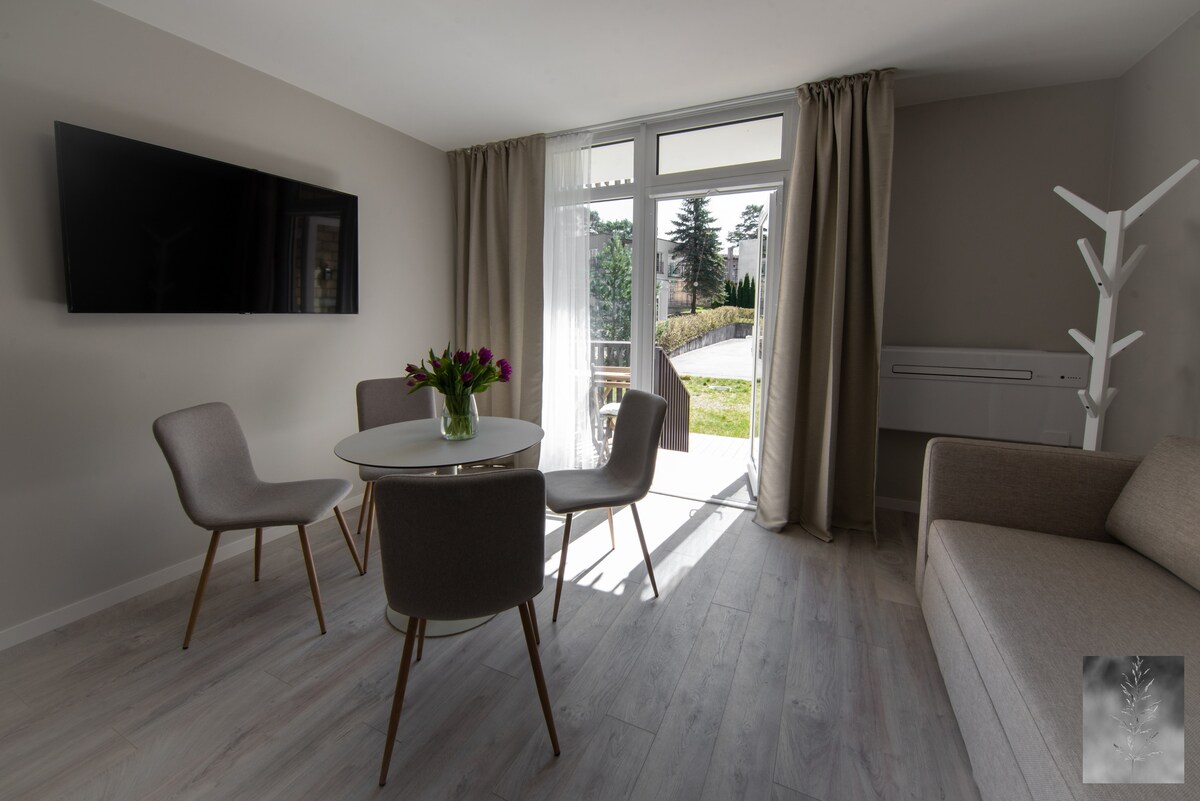 A stylish and newly furnished apartment with terrace in the heart of Juodkrante and a minute walk from the forest. It features a comfortable sofa-bed, double bed, TV, kitchen, a desk for dinning as well as a shower. The building is surrounded by nature, there is a 1.1 km forest path to the sea and a 2 min. walk to the lagoon. There are 3 apartments within this type and it will be assigned automatically. You will receive a key code to enter the building as well as your room.