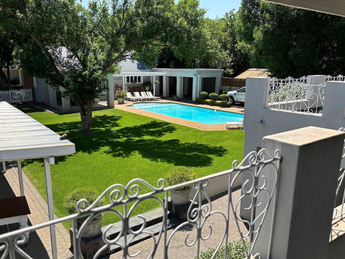 Experience a tranquil and picturesque overnight retreat in Klerksdorp within our private guest suite. This cozy space features a queen-size bed, mini-fridge, kettle, microwave, study desk, TV, fan, and an en suite bathroom. Additionally, a braai can be arranged upon request. Nestled separately from our main residence, ensuring utmost privacy. Conveniently near major schools and hospitals. Full access to dam, river and swimming pool. Perfect for wedding guests or business travelling.