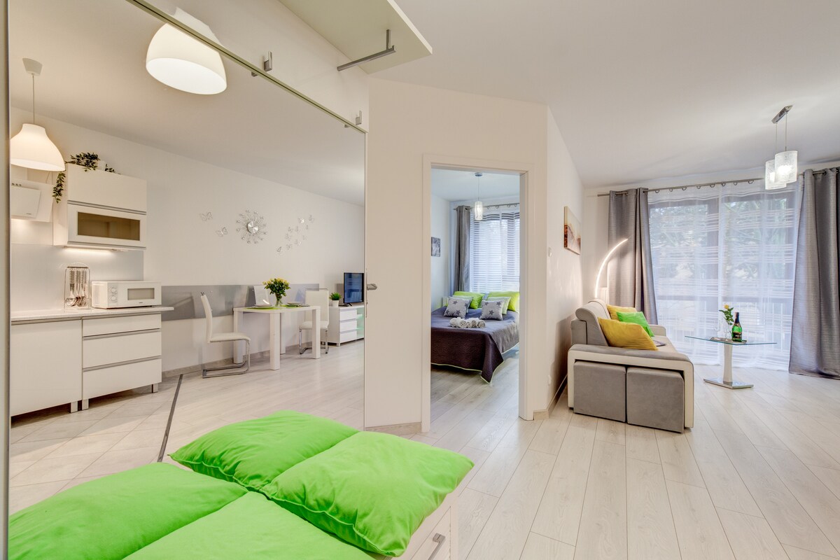 A new, cozy and comfortable apartment in the old town, right next to the Castle. In a new, comfortable building. Very close to all attractions - you can visit Szczecin without a car. Easy check-in at a convenient time. High-speed internet, TV with Netflix, books, games and a shared rooftop terrace will make your stay more pleasant.