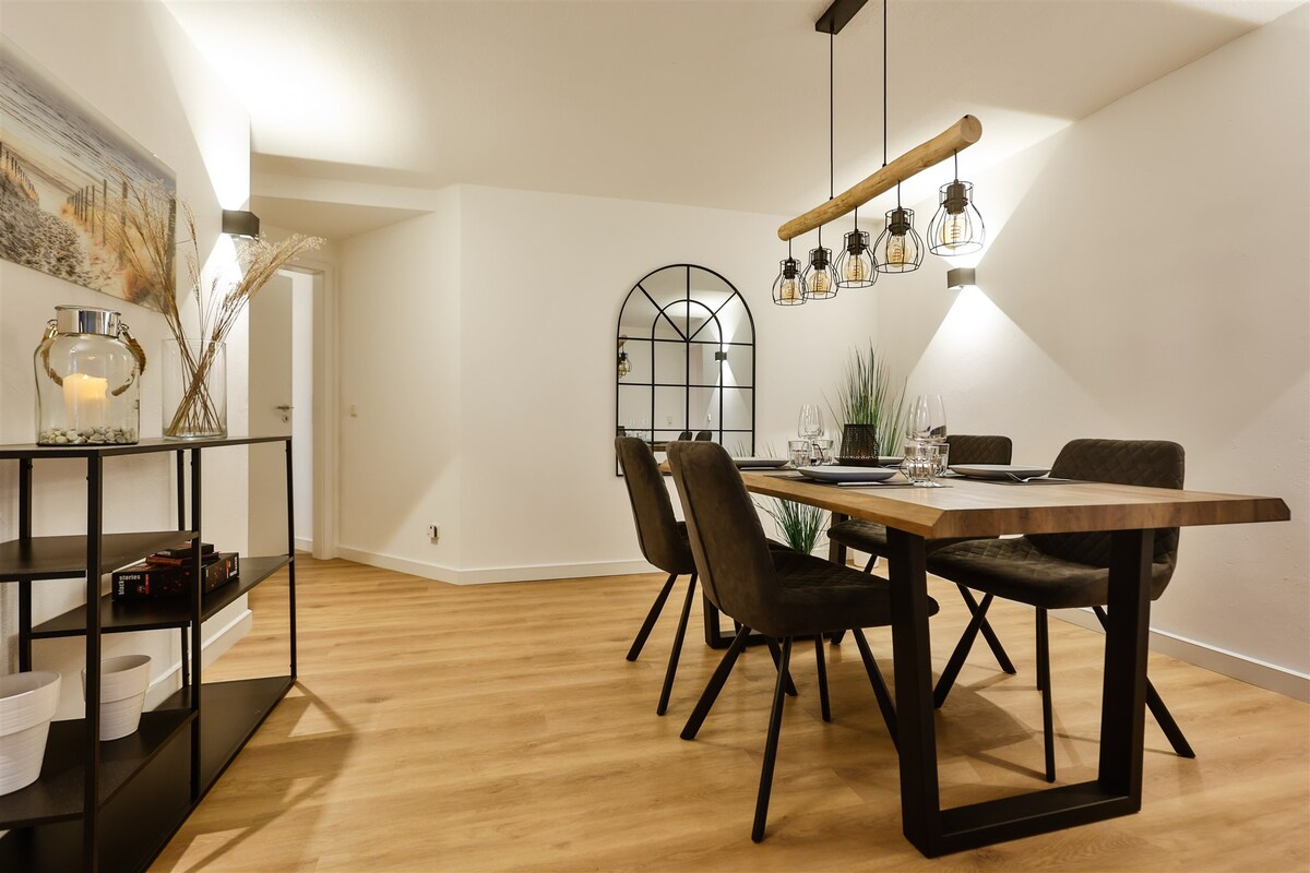 This spacious apartment with over 155 m² of living space was integrated into a former hayloft of a farm in the idyllic Efkebüll. It impresses with relaxed living on two levels and a special lighting: in the morning the sun greets the bathroom and kitchen, wanders during the day in the spacious living and dining area and says goodbye in the evening in the bedroom. Generosity, spaciousness and the undisturbed view through the lush window front characterize the living experience.