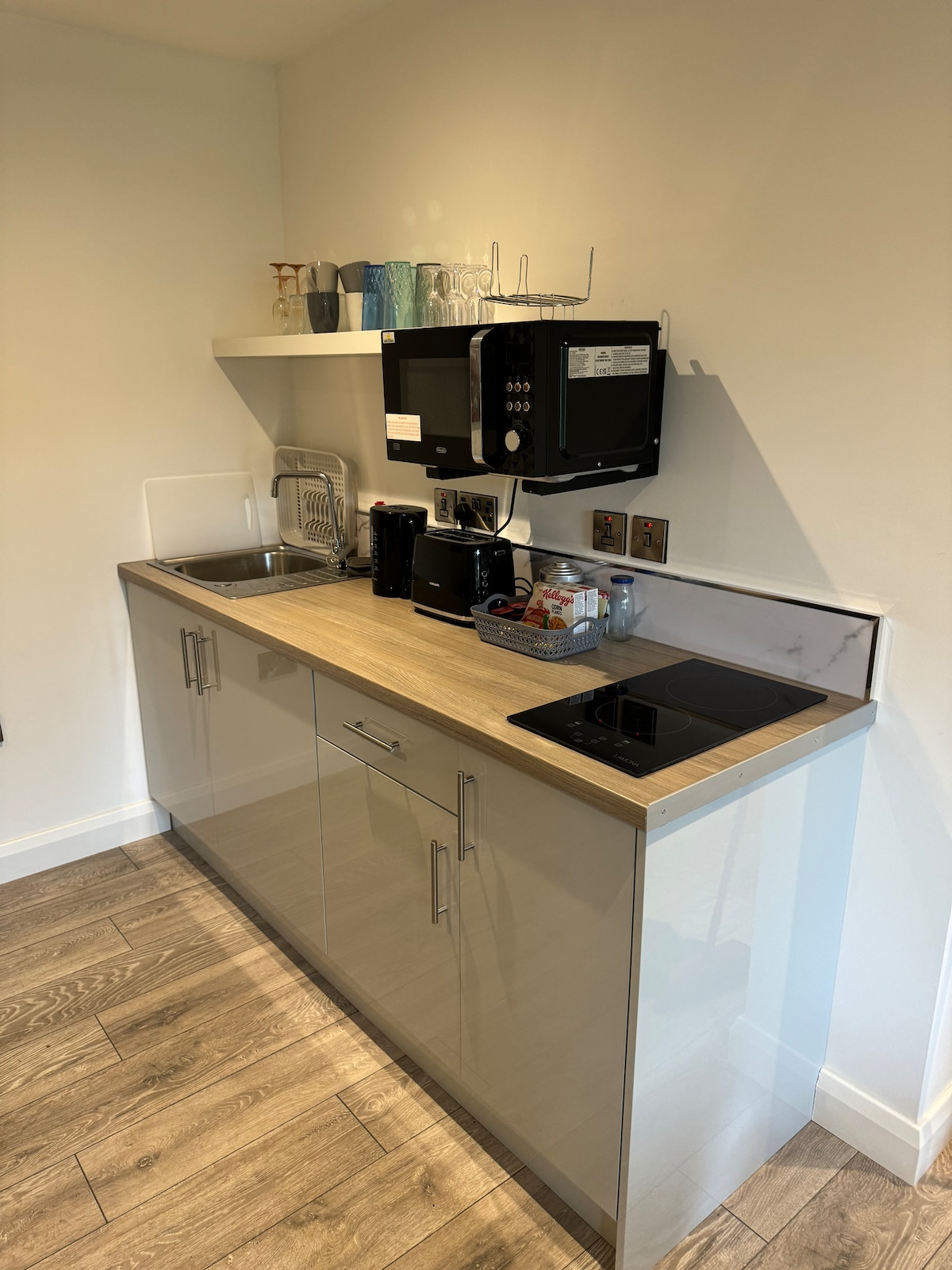 Self contained holiday let set in a rural location which sleeps 2 adults. The accommodation provides one large bedroom which can adapt from double to twin beds. Good storage is provided in the bedroom and hot press area. The bathroom is designed with a walk in shower. Kitchen/ living space provides a washing machine, fridge freezer, microwave, gas cooker, electric oven, utensils and kitchenware. Breakfast bar and sofa. Also 2x TV's.