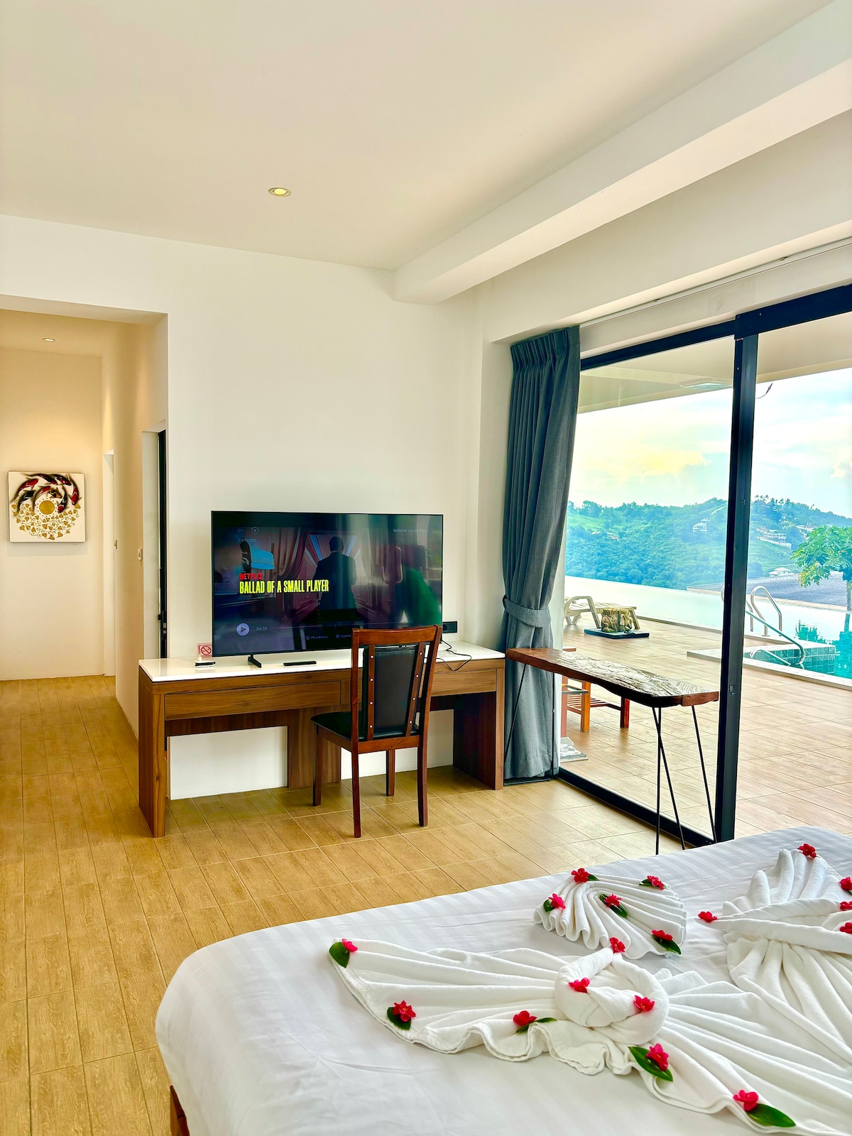 620 m² private luxury villa with 180° sea view on the hills of Chaweng → Daily breakfast & cleaning → 25m high infinity pool → Gym, billard, dart & table tennis → Hospitality with 24/7 on-site staff (English, Thai) → Concrete egg-shell bathtub → Each bedroom with private bathroom → High-speed Internet & WiFi → Cinema smart TV with Netflix → Bose sound system → Free coffee & drinking water → Water and electricity included → 10m drive to beaches → More services available on request