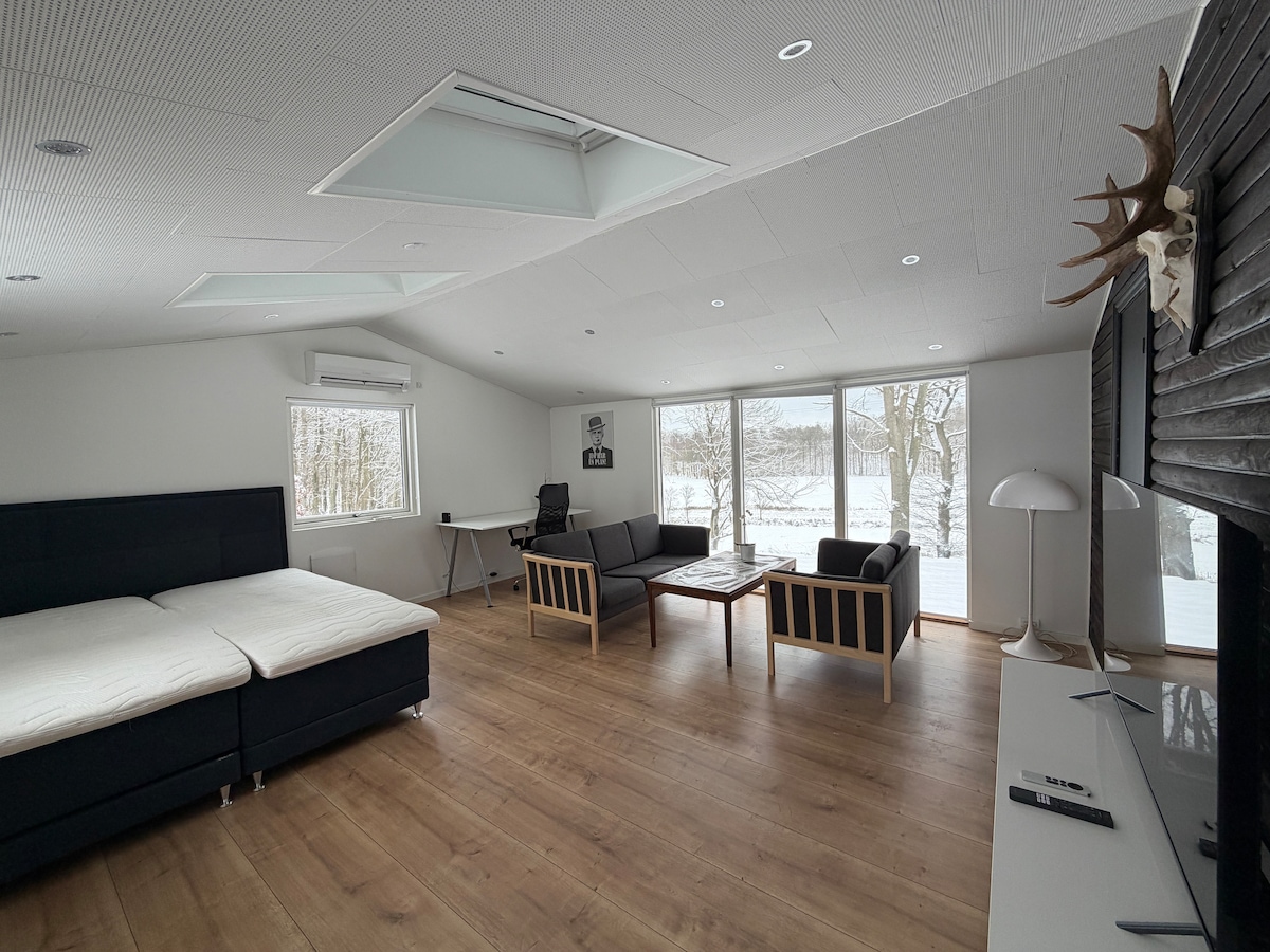 Bright and modern double room of 27 m2 in annex with private entrance and beautiful views of the lake and horses. Located undisturbed, in the middle of the forest, but only 40 minutes from the center of Copenhagen. Large double elevation bed, wifi, TV, dedicated workspace, sofa arrangement, access to full kitchen and bathroom and nature/wildlife as far as the eye can see 🦌 I live on the other side of the courtyard, but there are also several kilometers to the nearest neighbor, and forest on all sides.