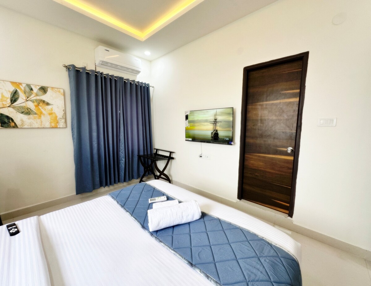 A modern hotel room in the heart of Madhapur, Hitech City. Designed for comfort and style, this newly launched stay features elegant interiors, cozy bedding, high-speed Wi-Fi, air-conditioning, and smart TV. Perfect for business or leisure, it offers easy access to HITEC City, major IT parks, restaurants, and cafes. Experience hotel-grade comfort with Servostay’s warm hospitality — your peaceful retreat amidst Hyderabad’s vibrant tech hub.