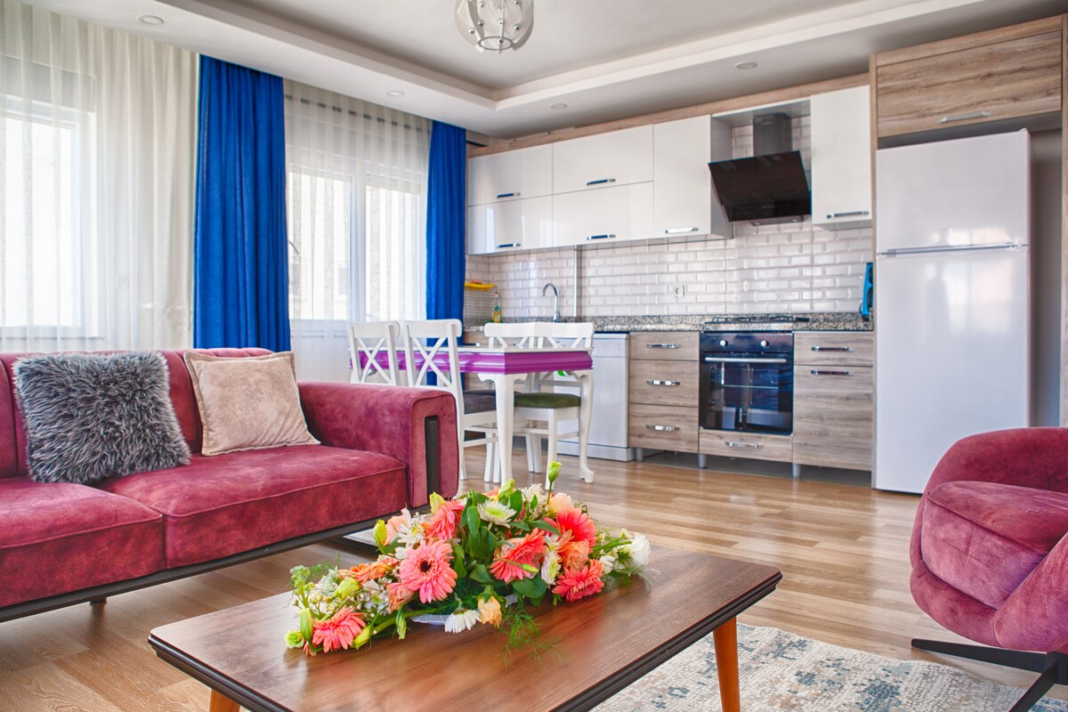 Located in the center of Konyaaltı District, this apartment has 1 bedroom, 1 living room, 1 kitchen, 1 bathroom and a balcony. There is air conditioning in the bedroom and living room. Our apartment has a combi boiler and 24-hour hot water. It is offered to our guests with a washing machine, dishwasher, stove, oven, hood, microwave, combi boiler, toaster, hair dryer, filter coffee machine, Turkish coffee machine, kettle and 2 smart TVs.