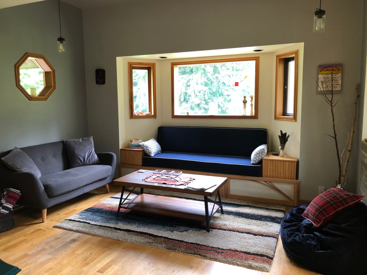 Experience the town of Nelson and the Kootenay Mountains while living on your own private mountainside property located just outside of town. Tucked away, under 10 min from downtown Nelson, the chalet is nestled on a private property surrounded by lush forest with a creek, waterfall and private trails steps from the door. Enjoy an 8-person hot tub, 2 outdoor decks, walking trails and more. This is the closest lodging option to Whitewater Ski Resort, just 5 minutes up our road.