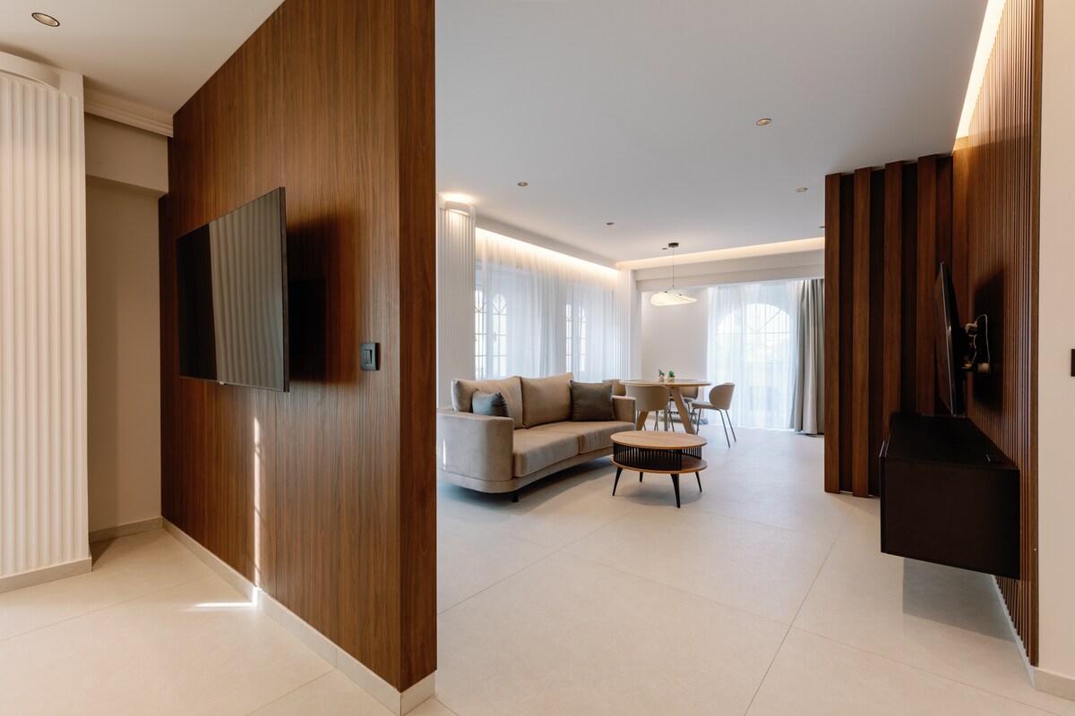 Welcome to your luxurious modern apartment nestled in the heart of the enchanting Old Town of Kos Island, Greece. As you step through the ancient streets, you'll find yourself ascending to the first floor, where your sanctuary awaits. Upon entering, you're greeted by an ambiance of contemporary elegance and comfort. The open-concept living space seamlessly blends modern design with timeless charm. Soft ambient lighting illuminates the space, creating a cozy atmosphere perfect for relaxation.