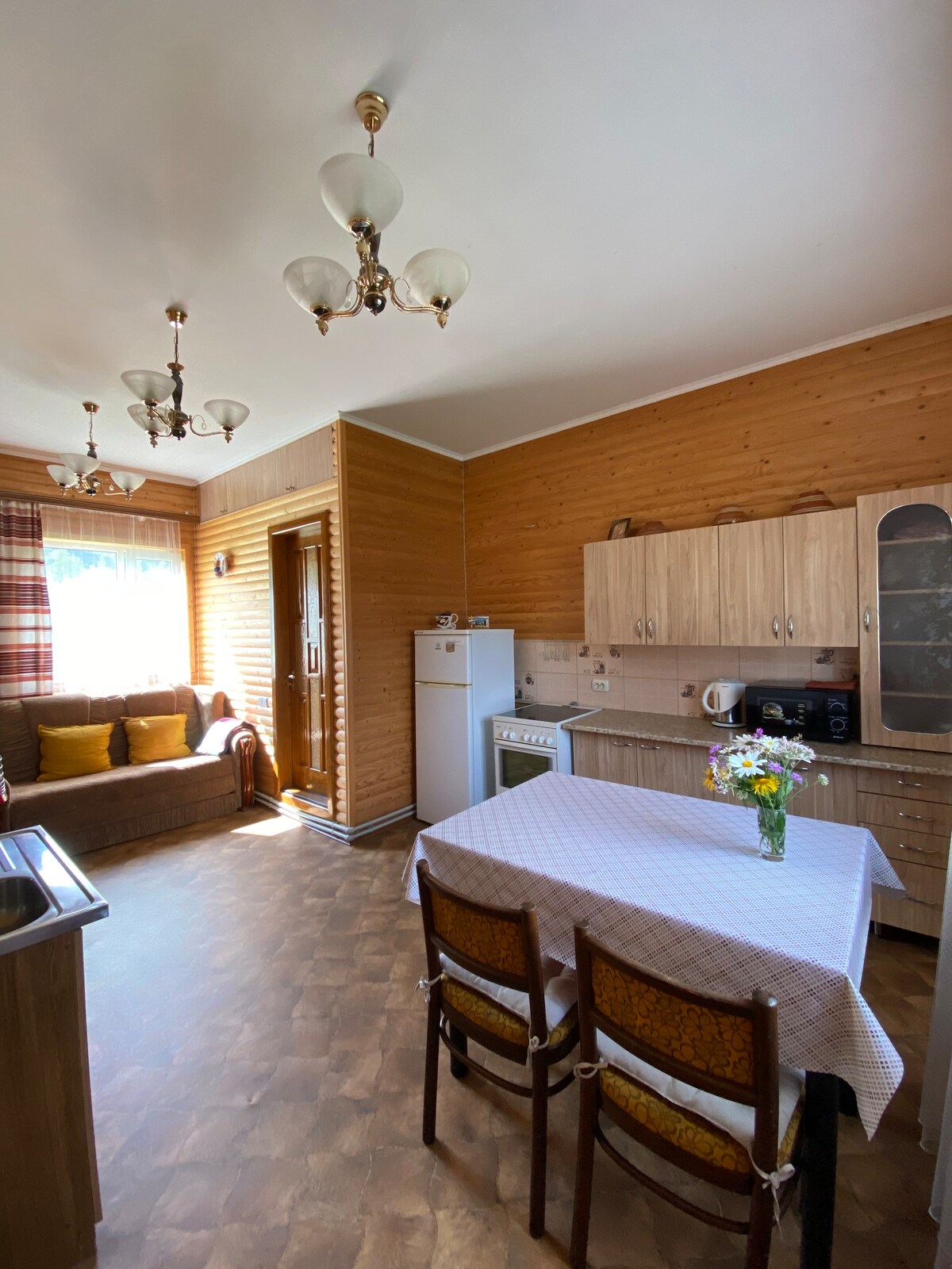 Здається деревяний Котедж , басейн , сауна, відпочинковий зал ,, супутникове ТБ, WI-Fi , Безкоштовна парковка для авто , Кухня , холодильник, електрочайник, столовий та чайний сервізи, та багато чого іншого. 3 спальні (4 двохспальні ліжка), 3 санвузли (душова кабіна у кожні кімнаті, унітаз, умивальник), кількість рушників – 2 на особу. Балкон з видом на гори . За Додаткову Оплату є Кухар який може готувати для вас.