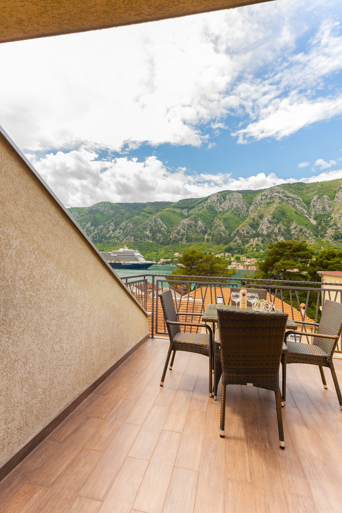 Dear guests, You are looking at an apartment in the house that exists in Kotor for more than a 130 years. Great sea front penthouse apartment (70 m2) with sea view, located 15 min. walk from historic Old town Kotor. Place is good for couples, solo adventurers, business travelers, and families (with kids).The sea is just in front of the house and dock where you can relax in the sun and go swimming.