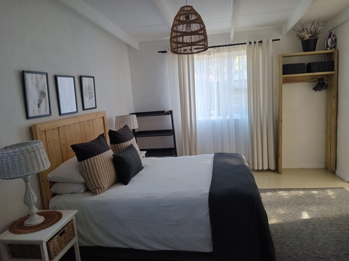 A quiet escape located in a lovely residential area in Jeffreys Bay. Our garden cottage has an open plan layout with a kitchenette and lounge. The bedroom offers a queen bed and has an ensuite bathroom with a shower and toilet. The outside area has a picnic bench where you can enjoy the afternoon sun. 10 min walk from popular beaches and a 5 minute drive from Supertubes beach. Off-road parking available for this unit and secure parking is also available on request (subject to availability).