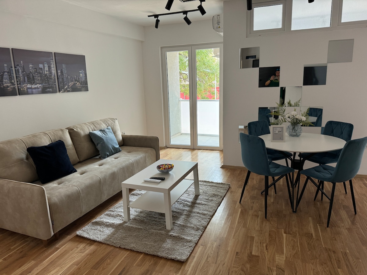 Enjoy a stylish experience at this centrally-located place This is BRAND NEW 60m2 apartment 5 minutes on foot from city park (stadium) and from the main square. Best possible location, very close to the lovely streets of Debar Maalo with many bars and restaurants. The apartment is with 1 bedroom with queen sized bed, and a living room with comfortable sofa bed + pull out bed Also 2 balconies from both rooms, one overlooking Vodno mountain. You can use it to drink a coffee or have a lunch