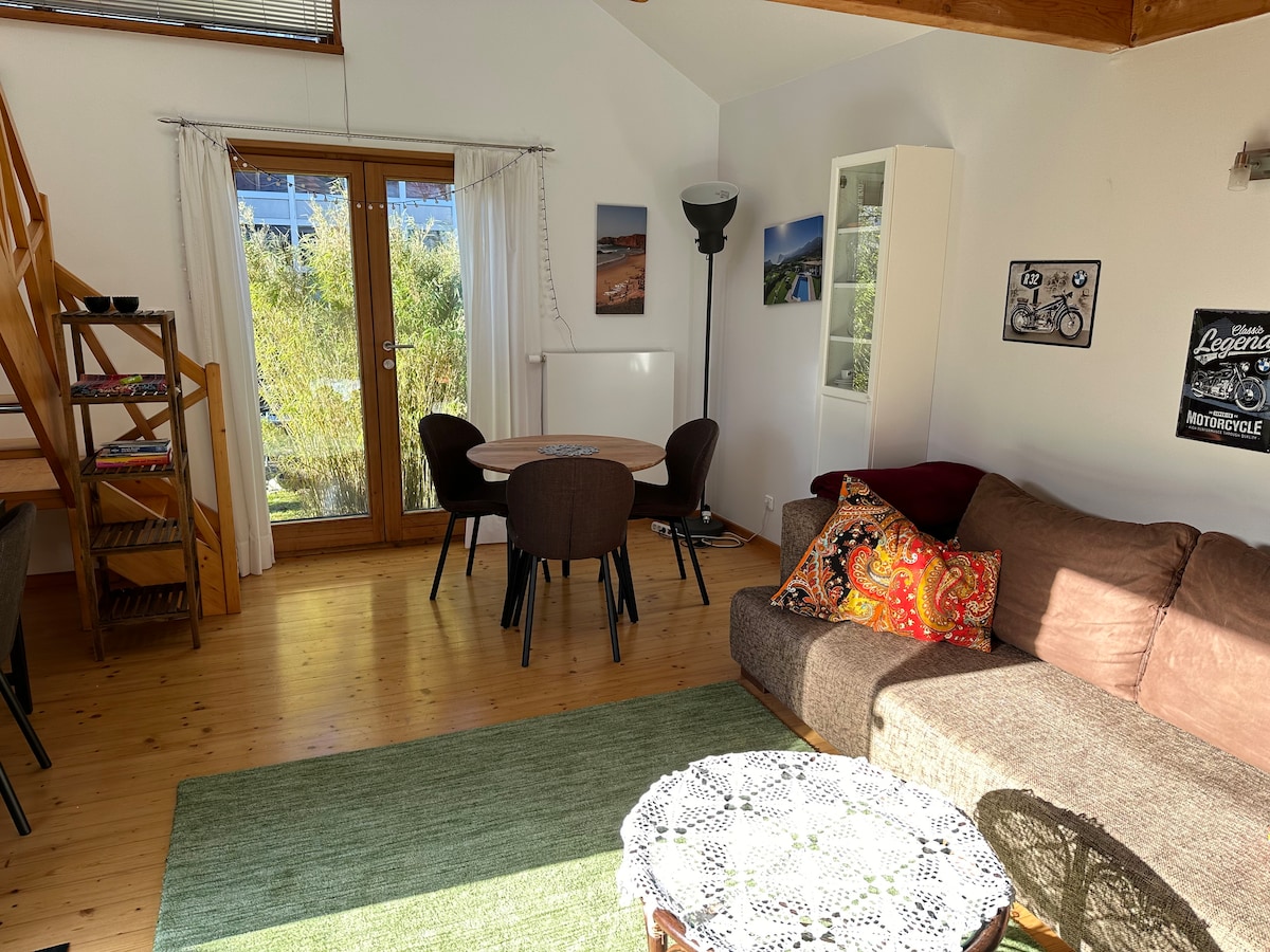 Small guest house with private garden and separate entrance - close to the airport (10 minutes by S-Bahn). Private bathroom and a well-equipped kitchen with stove, living room on the first floor. The sleeping area is located on the gallery. The house is fully available to the guest.