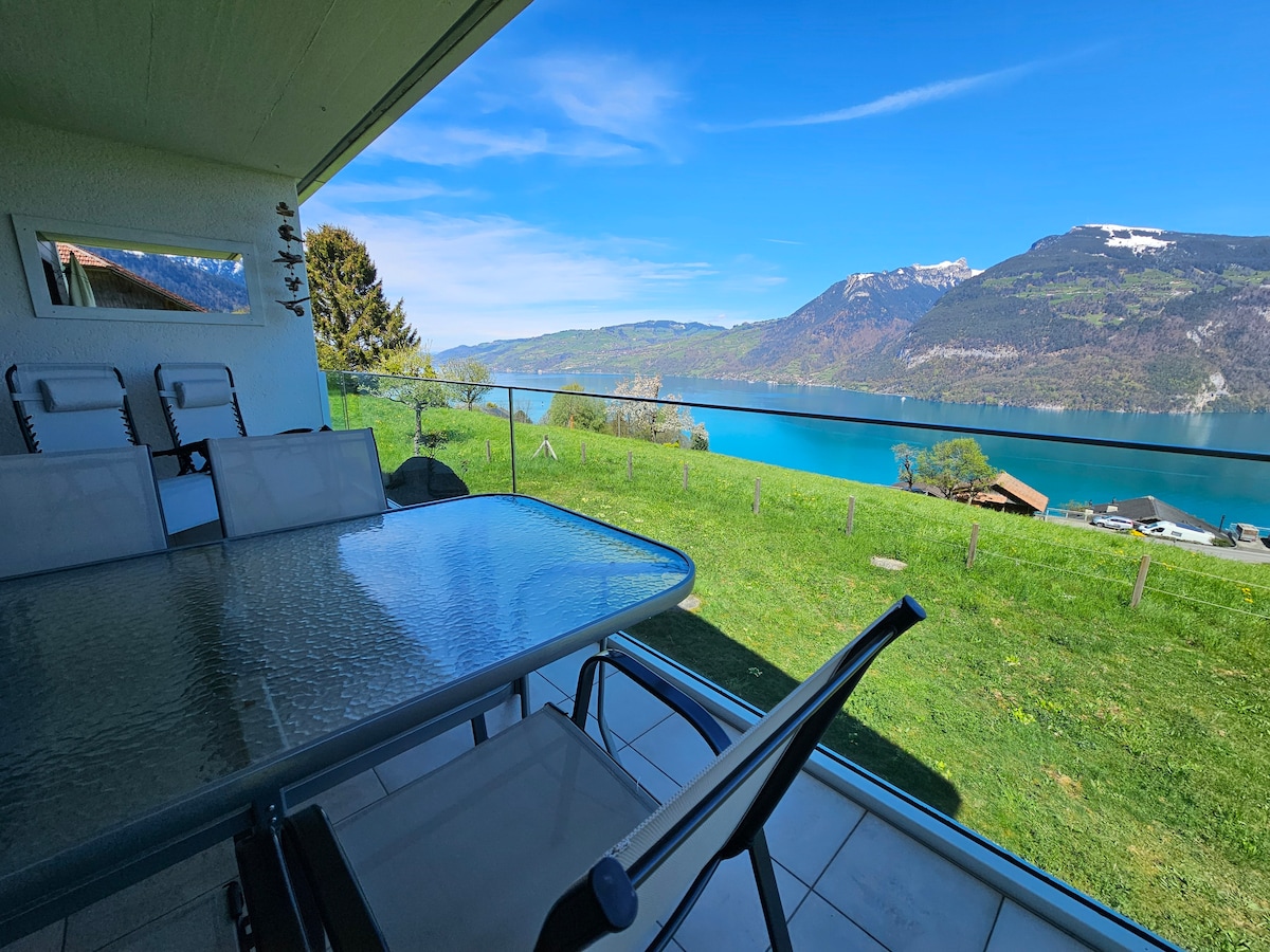The apartment is located directly on Lake Lucerne. No public path or road lies in between. Balcony with magnificent lake view, private terrace directly on the lake and private lake access. Lucerne is about 40 km away and can be reached by car, bus, train and also by boat. Zurich is about 70 km away. Tourist tax and final cleaning are included in the price.