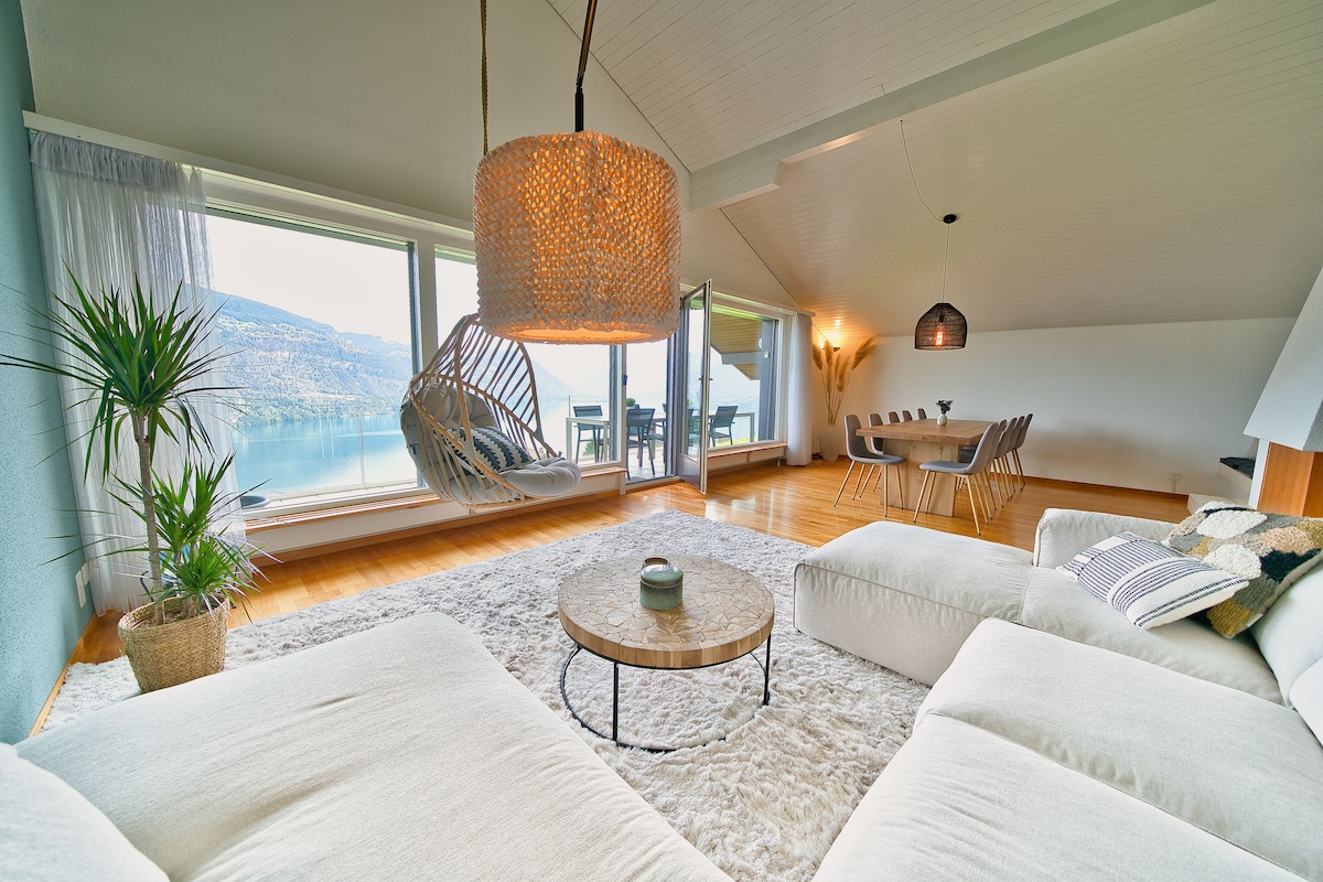 Private suite on the top floor of the owner-occupied Villa Wilen, directly on Lake Sarnen, unique alpine views, sunrises Spacious bedroom with home cinema, the panoramic lounge, large kitchen and bathroom (all privat area). For 3–5 guests, an additional private bedroom with bathroom is provided one floor below (lift access - shared area). Lake and garden access, SUPs, free parking & WiFi. Children welcome, small dogs only. Most popular Swiss Airbnb. Most highlights are reached within 1 hour.