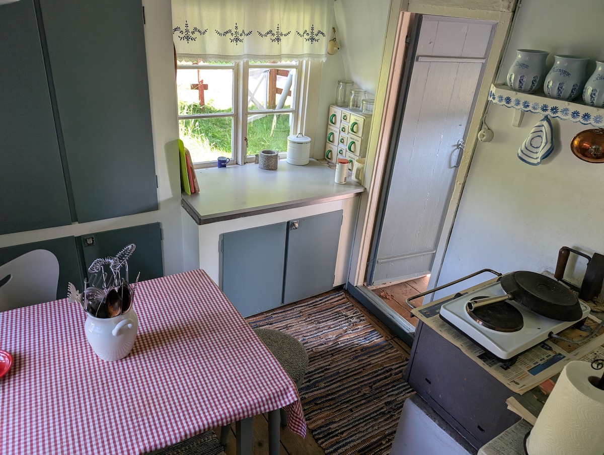 Live the simple life in this remote, nature-friendly and centrally-located accommodation. Own large plot 300 meters from the city center. A cottage of 20 sqm and an old cottage. Comfortable beds, a sofa bed for two and a bunk bed. Outdoor toilet with hand wash. Shower in another house. Bicycles. Hammock. Hammock. Refrigerator. Stove. Coffee maker. Table fan. Radio. Water in a jug. We do the dishes for you for free. Sheets and towels SEK 50 pp. Cleaning SEK 300. Outdoor cat "to borrow". Birds and deer, also seen bats and tawny owls.