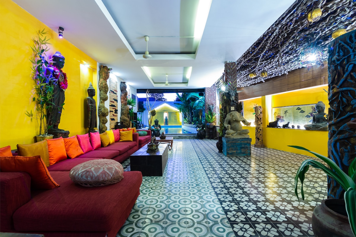 A spacious boutique home of 5 bedrooms with a private pool, built in a unique style of Khmer and Western architecture with an oasis ambiance, located near the largest local market of Siem Reap, only 10 minutes from downtown Pub Street, and 15 minutes to the marvelous Angkor Wat. This beautiful villa is ideal for a group or a family to enjoy a private stay and feel as if you are at home. Authentic Khmer meals, transport/guided tours, and airport transfers could be arranged during the stay.