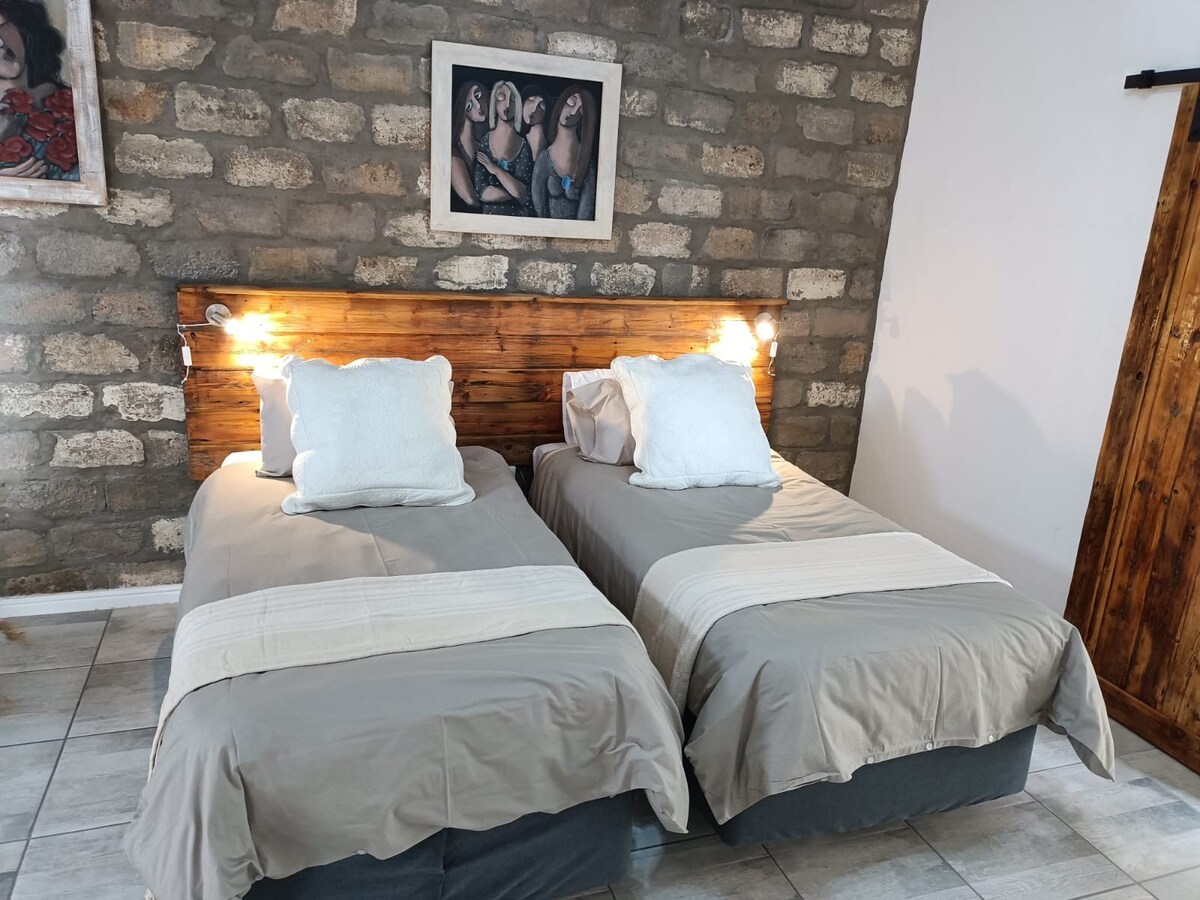 This private open-plan self catering farm cottage offers old-world charm with a stylish, minimalist touch. Designed for eco-conscious living, it runs on minimal electricity and features a fridge-freezer, water cooler, gas stove, and gas geyser. While there’s no TV, WiFi, or strong network coverage, it’s the perfect place to unwind and disconnect. With luxury linen and cozy details throughout, the cottage offers a peaceful, comfortable escape—your ideal home away from home on the farm.