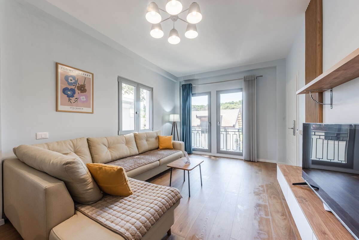 All the craftsmanship and creativity of one of Albania’s top interior design studios has been poured into this apartment. A space infused with Mediterranean simplicity, minimalist elegance, and a subtle “vacation vibe” in every corner. All of this is wrapped into 70 m² of comfort—including a generous 10 m² balcony where you can enjoy views of the aquapark and the rolling hills surrounding the village of Golem.