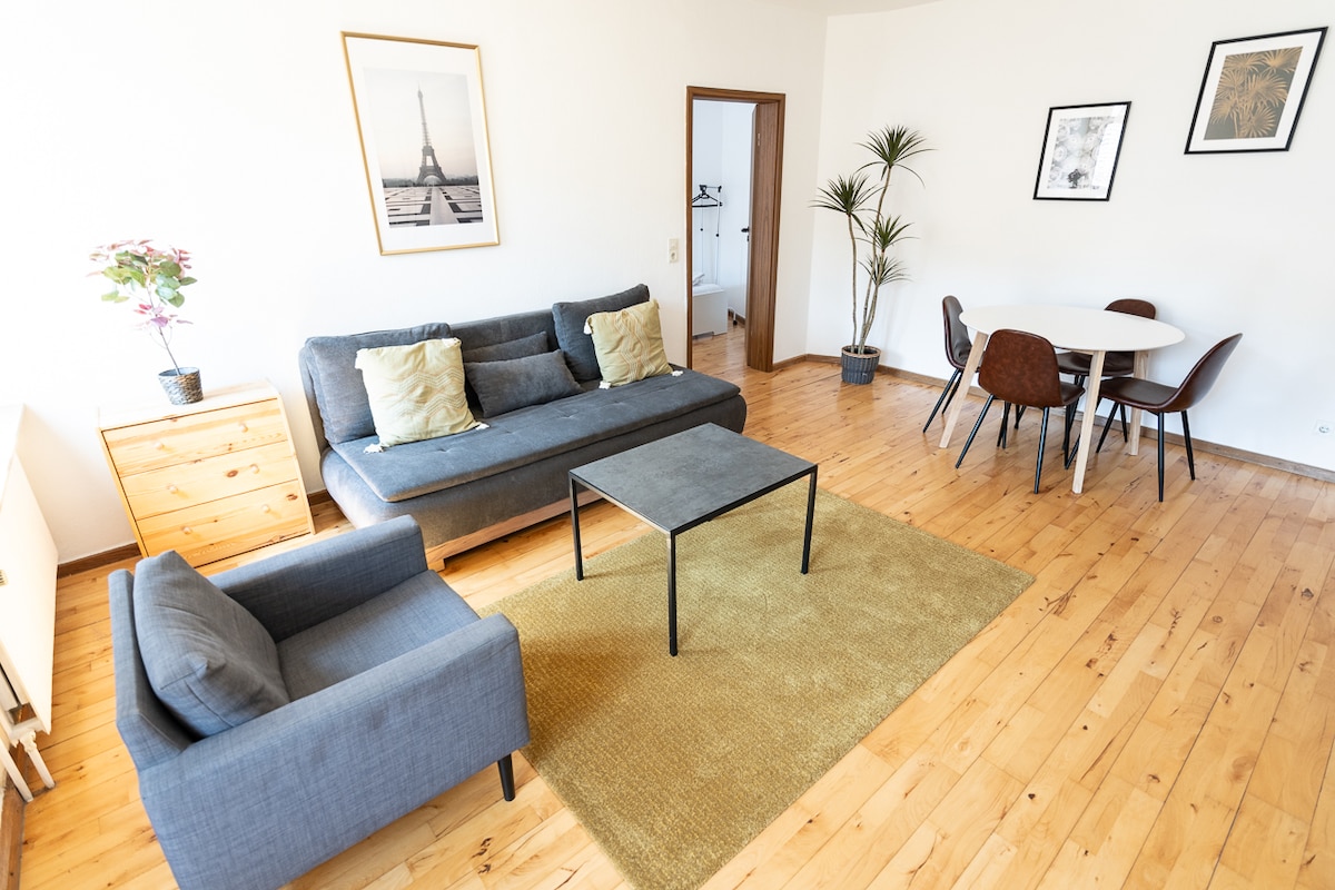 Welcome to your bright and quiet 1-room apartment, ideal for your stay in Kulmbach. The apartment has its own balcony where you can relax and enjoy the fresh air. Location: - Only a 15-minute walk to the city center. - A bakery and bus stop are in the immediate vicinity, which makes your everyday life easier. **Amenities:** - A comfortable sofa bed that is easy to pull out to provide extra sleeping space.