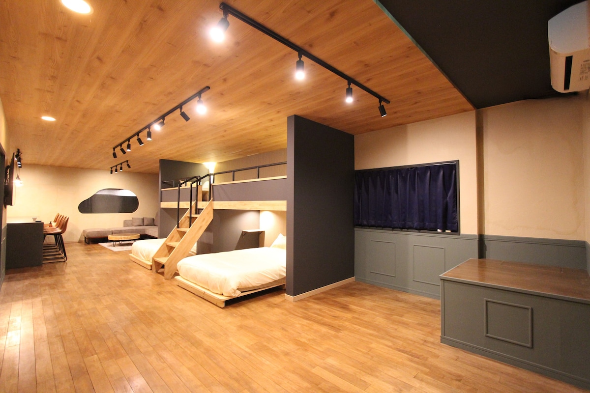 This private hotel is about 1 km from the new downtown area in the center, and has a luxurious 80 m² one-floor space with free parking. The kitchen is fully equipped with basic facilities such as a refrigerator, microwave, and cooking utensils. There are also popular ramen shops, bars, cafes, and supermarkets nearby, making it a convenient location for sightseeing and long-term stays. Perfect for families and group trips! Designed with a spacious living space and a place to enjoy conversations with family and friends. You can also rest from your travels with a large dining counter and a bathroom with a bathtub. Room features ☆ 80 m² spacious space ☆ ☆ 20 m² living, dining and kitchen ☆ ☆ Bunk bed (2 double beds, 2 single beds) ☆ ☆ Kitchen, washing machine and dryer for a comfortable long stay ☆ What you'll love Perfect for parent-child travel: children can feel safe and parents can relax Convenient for sightseeing: 17-minute walk to Kumamoto Castle, 15-minute walk to downtown Historic Shinmachi area: Enjoy retro cafes and local flavors