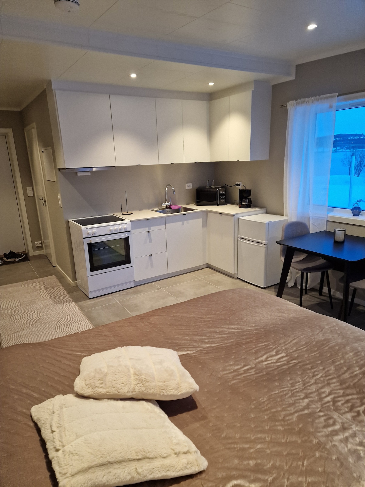 Downtown apartment by the waterfront. 14 minutes walk to the core of the city's restaurants and shopping mall. The apartment is warm and comfortable, with first row views of the sea, the mountain lift and Tromsø Bridge. Good bus connections and grocery stores nearby. The kitchen has what you need to prepare and enjoy meals at home. Made beds and towels. Two closets. Here you can relax and at the same time enjoy the view of the landscape, when you are not out exploring the exciting Arctic Tromsø.