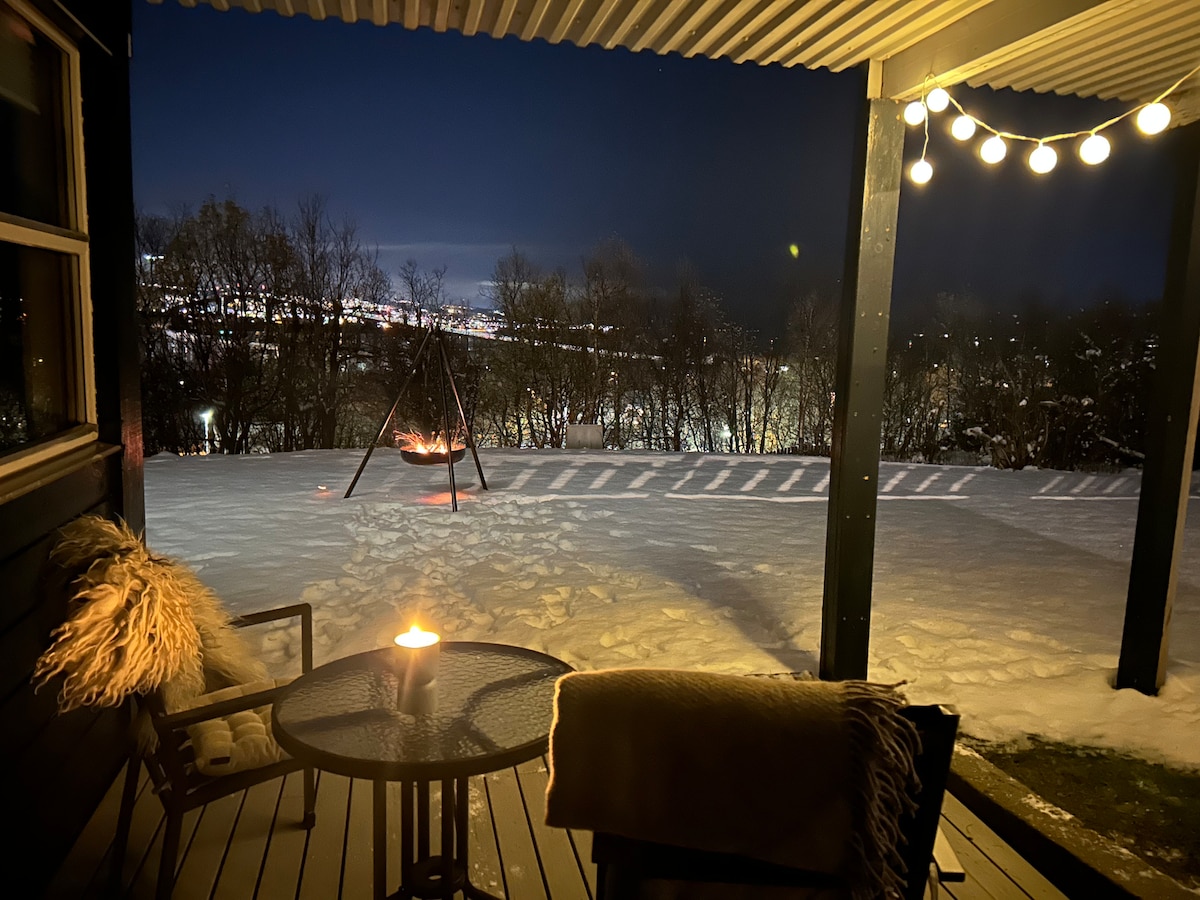 3 floor house with huge windows hovering above the city. ( has Turkish steam room spa) The roof top terrace gives you 360 view to all surrounding mountains. Moreover, perfect condition to admire the Northern lights at night. House is located 1,2 km away from centrum of Tromsø, buss from to house (5min to centrum). has 2 bedrooms in 1 floor (4ppl) and large couch (sleeping) in living room 2nd floor. 3rd floor is washing machine and dryer with entrance to Terrace. Unique wooden style, 70m2