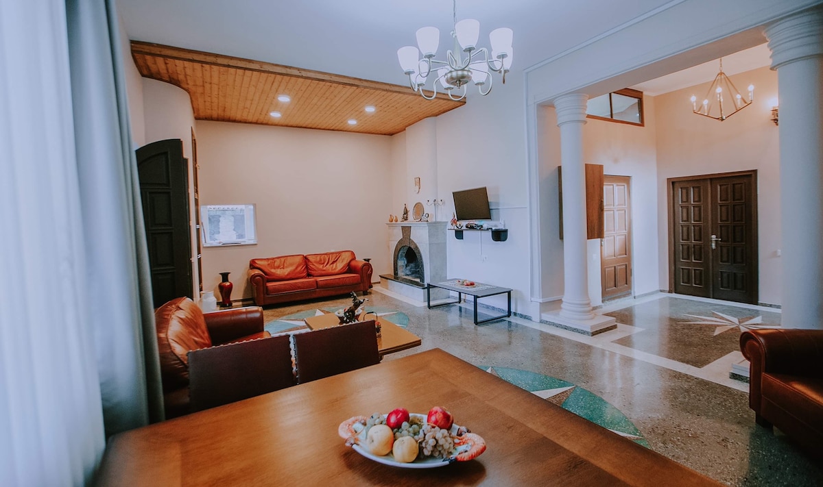 Kick back and relax in this calm, stylish space. This guesthouse is run by Gocha and his wife Nino, a warm and creative couple known for their hospitality. Gocha is highly skilled in crafting, and the entire home is decorated with unique handmade pieces, created by him. Every detail has its own story and adds character to the space. One of the most unforgettable features? A small cable-car food delivery that brings meals directly to the terrace — a charming touch guests always remember.