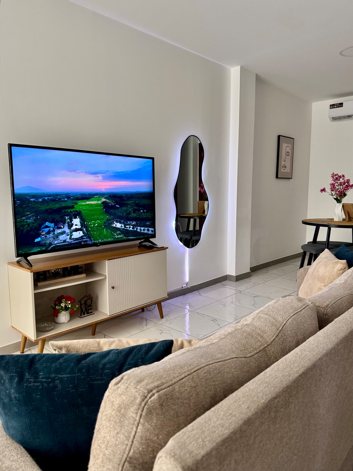 ☞ City view ☞ Location next to the City Mall ☞ Free parking ☞ Central air conditioning ☞ Queen size bed ☞ Sofa bed in the living room ☞ Pool ☞ Gym ☞ Ping pong table ☞ 55" TV in the living room ☞ 55" TV in the room ☞ Microwave