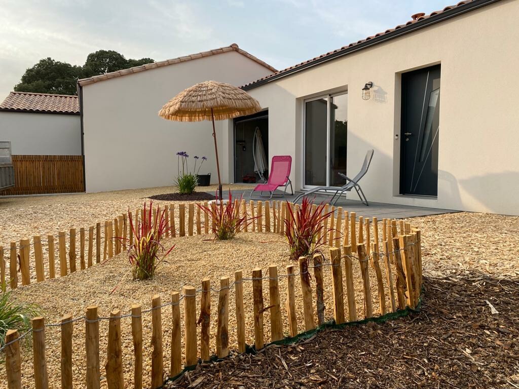 New house in La Barre de Monts, quiet cul-de-sac at the edge of the forest (beach 20 min walk, 10 min bike and 5 min drive). 80 m2, 4 rooms, 6 people The house comprises: Kitchen open to living room, furnished and equipped with induction stove/oven, fridge, dishwasher, microwave and washing machine. 3 bedrooms: 1 bed 160; 1 bed 140 and 2 beds 90. Bathroom, separate toilet Enclosed garden with terrace, garden furniture, parasol and barbecue. Free Wi-Fi (new)