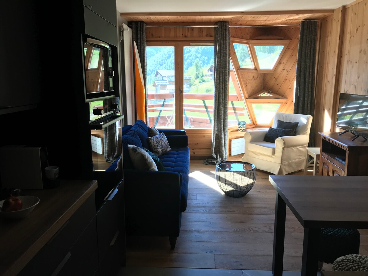 studio très fonctionnel (kitchenette avec machine à café, lave vaisselle, four micro-ondes, service à raclette, service à fondue)plutôt cosy, balcon exposé sud-est avec vue sur montagne.