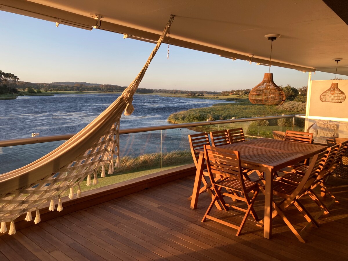 Beautiful apartment located on Laguna del Diario. Front-row building with ocean and lagoon views. Its own grill. Very comfortable and bright. Close to everything and with the peace of nature. It has daily maid service, a gym, sauna, indoor and outdoor heated pool, Jacuzzi, playrooms for children and teenagers, and a tennis court. 100m2 + underground garage. Emergency service is available for occupants.