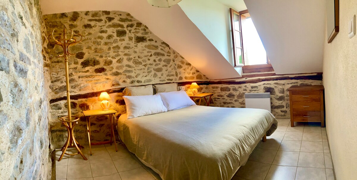 Located in the hollow of a valley, quiet, surrounded by nature, the accommodation is arranged in a recently renovated barn that is part of an old farm. You will enjoy simple and warm comfort in a bright living space. Access is via a small road serving only this old farm where we also live. The barn in which you will stay and our house are independent and not overlooked. Let yourself be lulled by the sounds of nature in this privileged place.