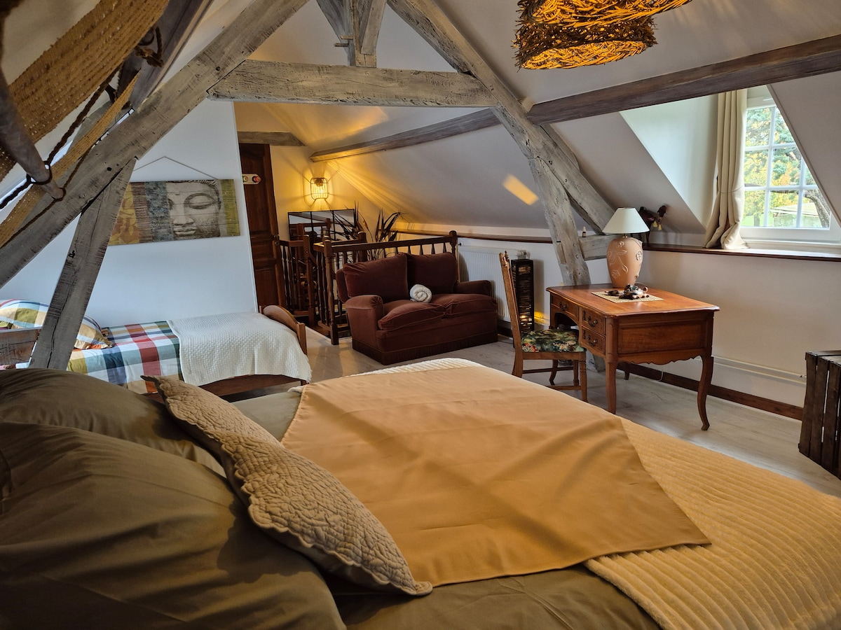 Enjoy the character of this spacious 44m2 suite upstairs of my beautiful stone house. Recently created, this suite is decorated in a refined style. ✓ Separate entrance ✓ King size bed (180/200) made on arrival ✓ Private bathroom ✓ Separate toilet ✓ Towels provided ✓ Wi-Fi ✓ Smart TV ✓ Lounge area ✓ Mini-fridge ✓ Coffee Maker ✓ Hot water kettle. ✓ Blackout shades ✓ Parking place How about getting green for a night or more? 🌳