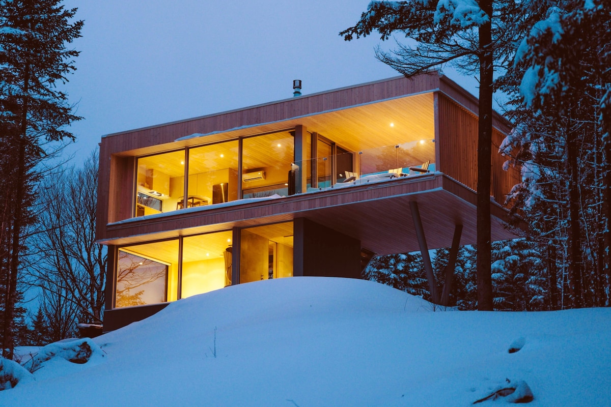 Escape to this tiny house perched atop a mountain and take in the panoramic views of the surrounding valleys and mountains through its glass walls. Unwind in the spa, available year-round, while enjoying the most breathtaking sunsets. Discover this hidden gem in the heart of the Canadian boreal forest, combining comfort and functionality in every season. An intimate and unforgettable experience, just moments away from the legendary city of Québec, a UNESCO World Heritage Site.