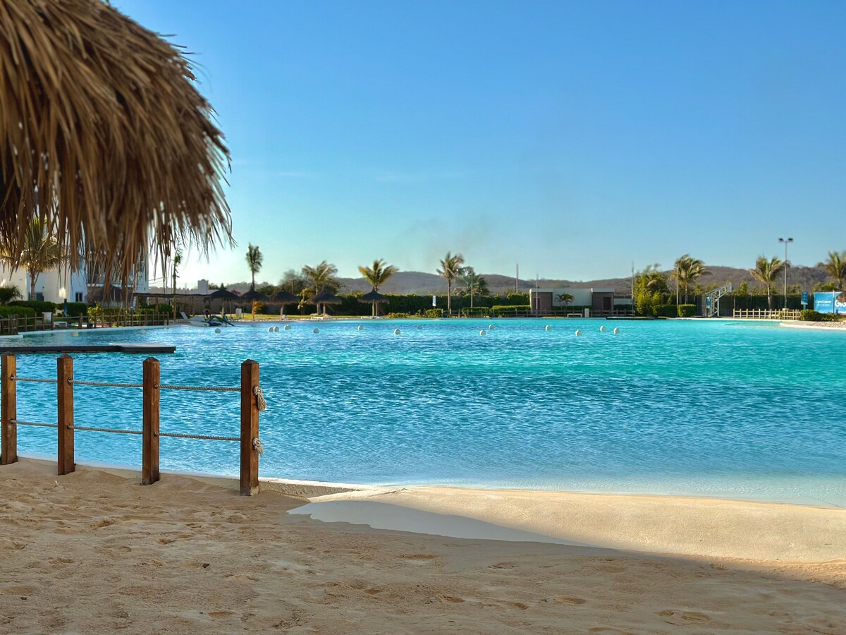 Moderno alojamiento en una espectacular laguna cristalina con playas artificiales de fina arena blanca. Ambiente seguro y familiar. Donde puedes realizar actividades acuáticas, como kayak, paddle surf, windsurf, nadar, asolearte en su playas , jugar en sus canchas de basquetball, volley ball playero, ejercitarte en su gimnasio, correr en su pista alrededor de la laguna, jugar billar, ping pong, cuenta con juegos infantiles. Departamento completamente equipado , cerca de centros comerciales