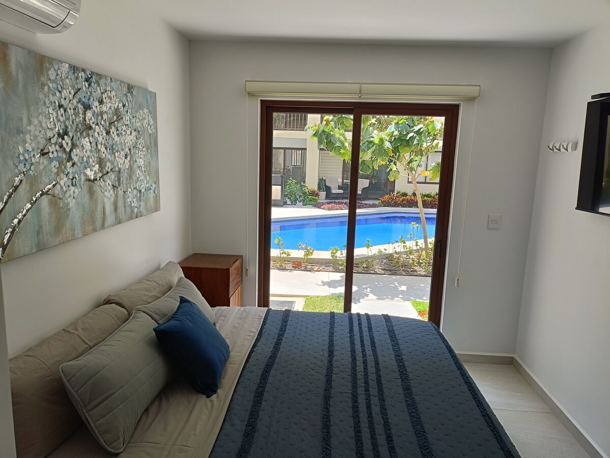 Tómate un descanso y relájate en este tranquilo oasis, en la comodidad de una cama king size con vista a la alberca, en planta baja, y disfruta las amenidades del sitio como son: un jacuzzi en el roof garden y tres albercas, una de estas climatizada en invierno. La playa a unos cuantos pasos del departamento.