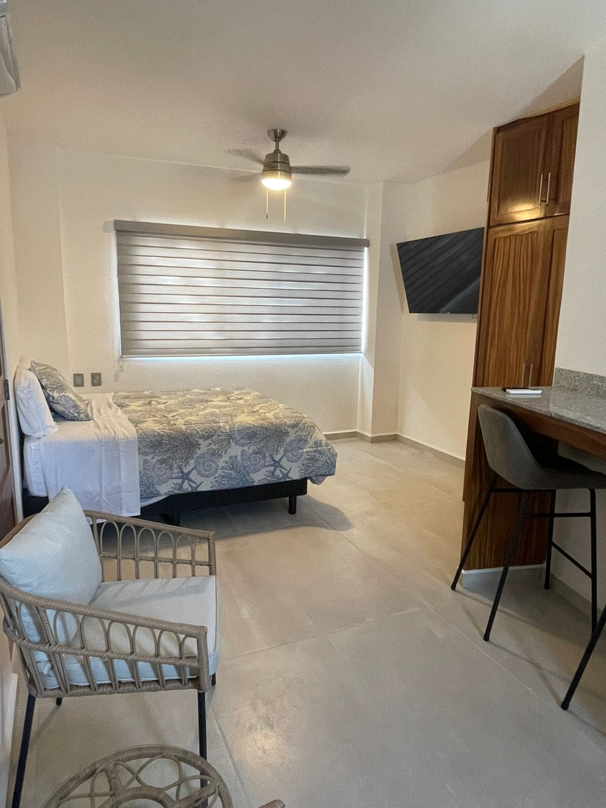 Comfortable 1 bedroom with a kingsize bed apartment, a cozy patio for two, and free parking on the street, right in front of the apartment. It is a one-floor apartment with optical fiber wifi. We have a small but functional kitchen and a big enough fridge. It is 12 blocks away from the Malecon, a 4-minute drive, or an 18-minute walk (1.5 km / 0.93 miles). The living room area has a couch to chill with a TV, there is also a smaller TV in the bedroom. There is no high water pressure in the shower.