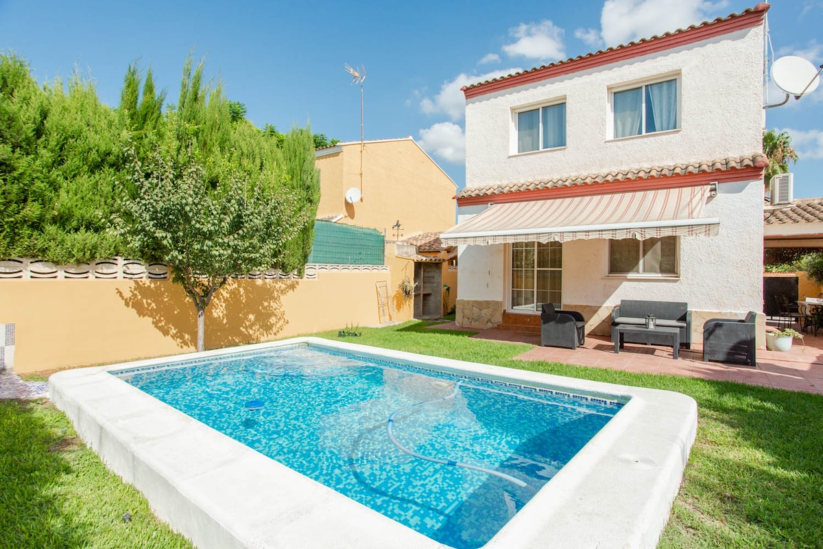 Coqueta casa de 60m2 con 320m2 de parcela. Cuenta con piscina, jardín con césped artificial, terraza solarium con vistas al parque natural del Turia y barbacoa. Tiene salón comedor-cocina, baño con ducha de hidromasaje y dormitorio con bañera de hidromasaje. Cuenta con aire acondicionado frío-calor en el salón y en el dormitorio. Está en una de las urbanizaciones más consolidadas de las afueras de Valencia, a 7' del aeropuerto y a 5' andando de la estación de metro.VT-47549-V