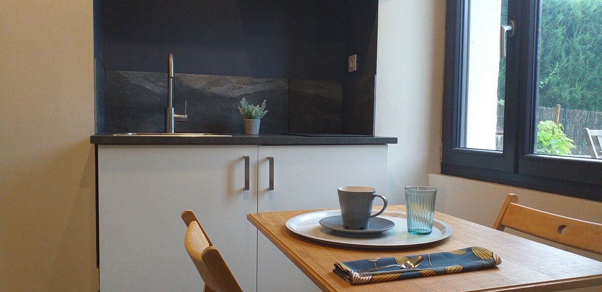 Independent studio on the ground floor, recent (2023) with bathroom and separate toilet. You can enjoy the 500m2 fenced garden with deckchairs, shaded area for outdoor dining. Here, we love animals and you are welcome with dog, cat, camel. Fully equipped with real bed with comfortable Bultex mattress and full kitchen with fridge, induction, coffee maker and kettle. Bed linen and towels provided. Washing machine for €5, detergent included.