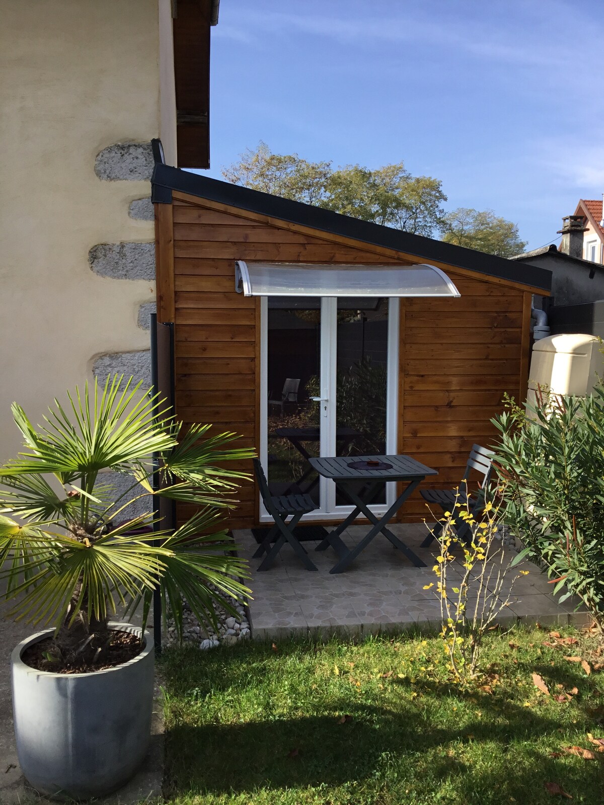 New independent studio with separate toilet, shower room, small equipped kitchen, double bed, sofa bed for 1 or 2 children only, and private garden with outdoor sofa furniture, deckchairs and table with chairs. Free private parking, entrance to the studio and in the enclosed property with motorized gate with digicode. Arrival and Free Access with digicode for the gate and secure key box for the accommodation. Quiet, close to the center of Chambéry.