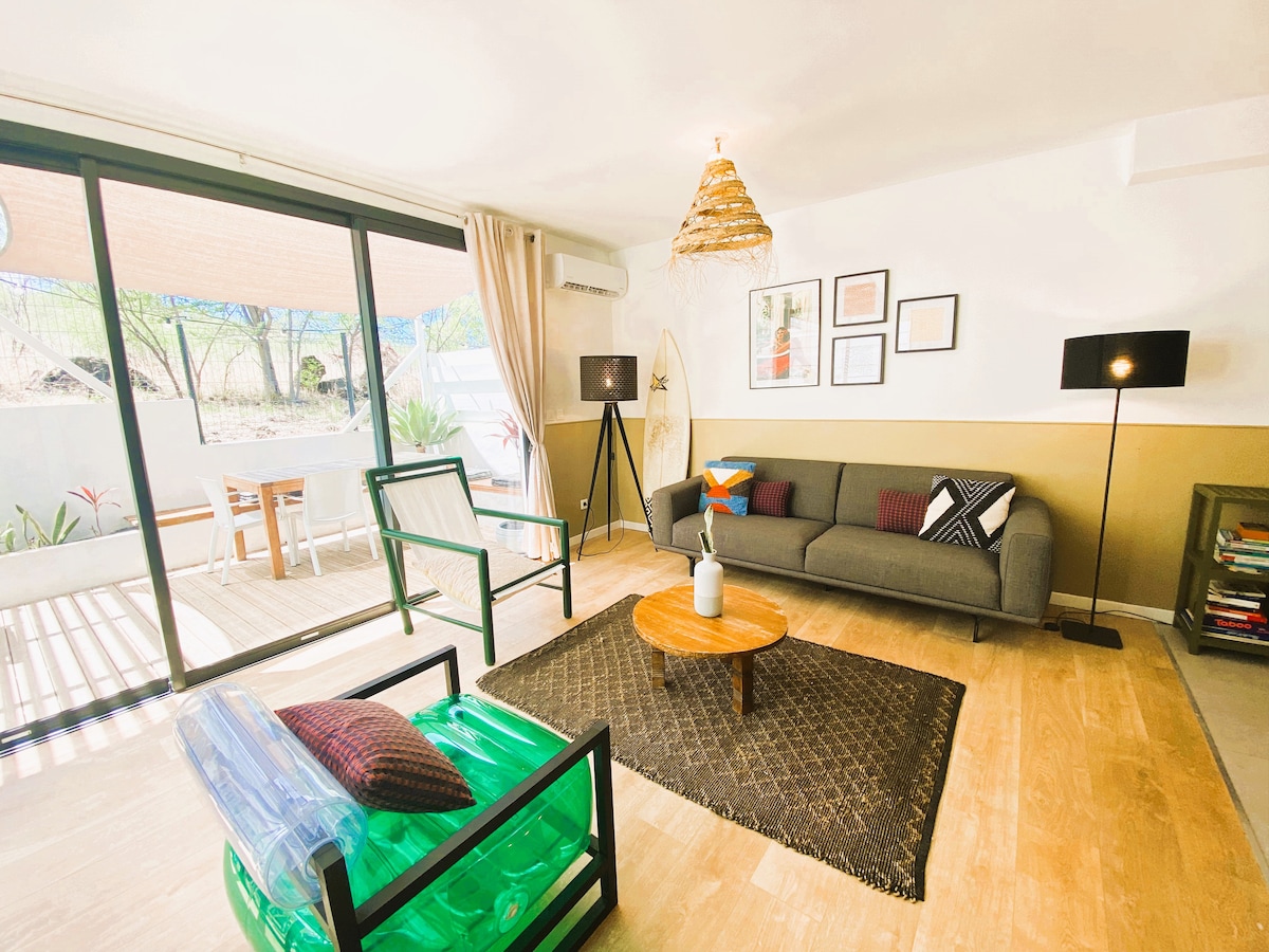 T2 jardin refait à neuf à 200m du lagon, il permet d'accueillir de 2 à 4 personnes. idéal pour un couple avec 2 enfants. L'appartement est entièrement climatisé connexion WIFI/TV 1 varangue spacieuse avec un agréable extérieur avec coin repas/apéro et jardinet. Cuisine entièrement équipée, frigo américain, four et micro onde, cafetière, lave vaisselle) 1 chambre avec un lit double 140/ 190cm, possibilité de fournir le matériel de puériculture (lit BB, chaise haute, porte bébé rando)