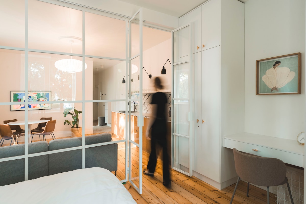 Charming studio apartment in wooden building, built in 1856 and located in a very old town. This 37 sqm space boasts equipped 60-tie’s style kitchenette, queen size bed and a big bath. The place is furnished with selected furniture of different decades.
