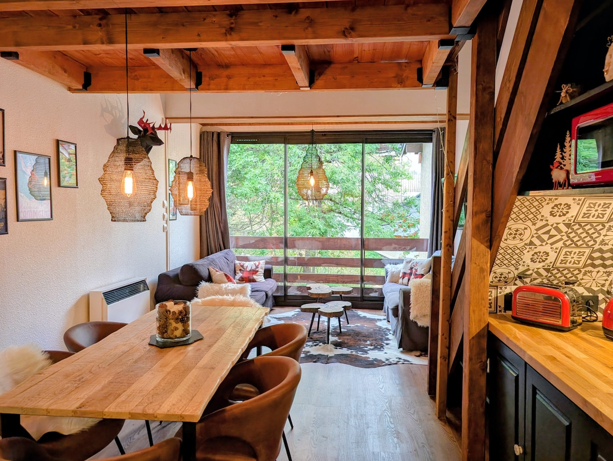 "La Biche" Studio Fully equipped 25 m2 studio with mountain views from the balcony. Perfect for a couple. In a quiet residence, not overlooked, it is on the top floor with elevator access. 2 parking spaces, including a private one in front of the residence and one below with a concierge year-round. Secure ski locker on the ground floor. 5 min walk to shops and the "Jassettes" chairlift. When snow conditions permit, skiers can arrive at the foot of the residence via the green slope.
