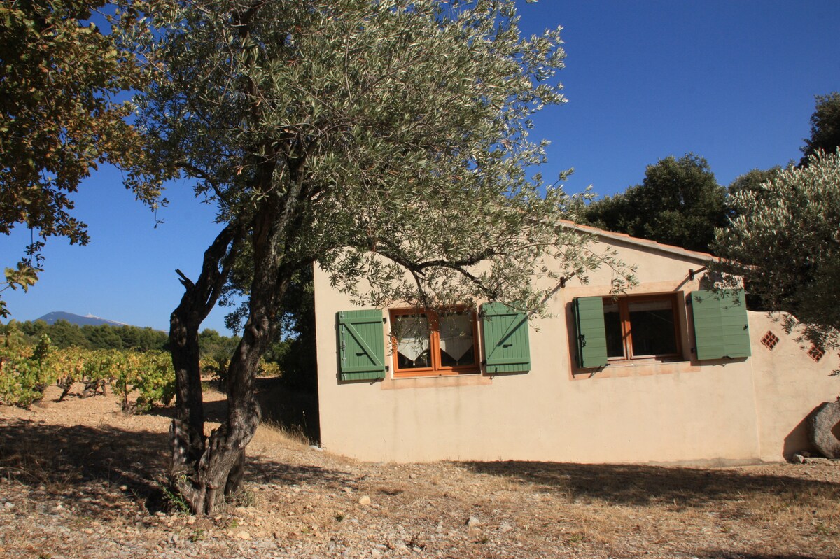 This small house is hidden between the lace of Montmirail and Mont Ventoux. Lost in the hills and olive groves with a bird's eye view of the Château du Barroux We live in a house close to this cottage without being attached, we have a nice dog and accept sociable animals. You will be happy to cross the forest and vineyards for a swim at Lac du Paty 2 km away.