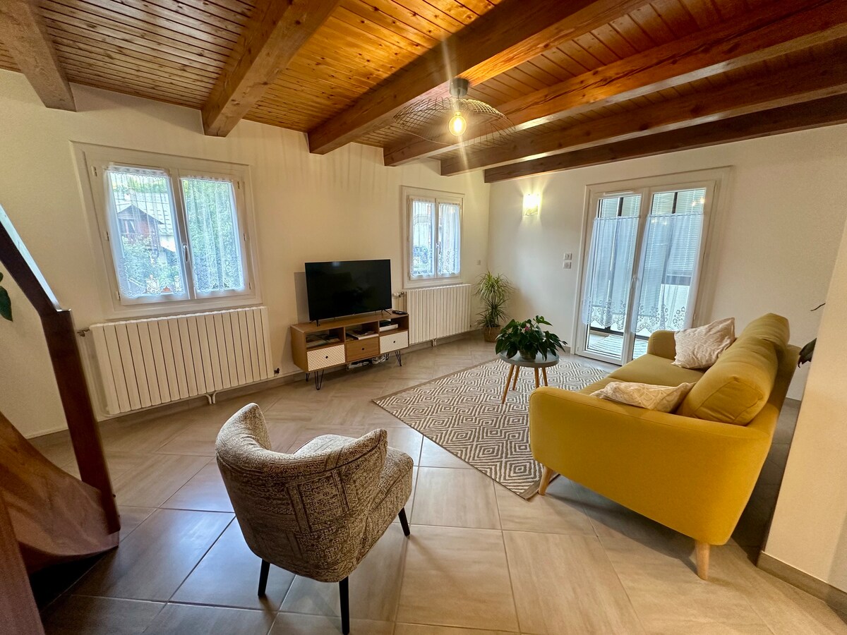 Appartement rénové de 28 m2 au 1er étage de notre maison avec accès par un escalier en colimaçon. Terrasse de 18 m² exposée sud, vue dégagée sur les montagnes. Quartier calme. 1 pièce avec coin cuisine équipé, salon avec tv, wifi, canapé convertible, 1 chambre avec un lit double (140x190cm) et deux lits superposés (90x190cm). 1 salle de bain avec douche et wc. Logement idéal pour 2, possible jusqu’à 4 personnes maximum. Stationnement sur parking privé. A 900 m du centre ville et gare.